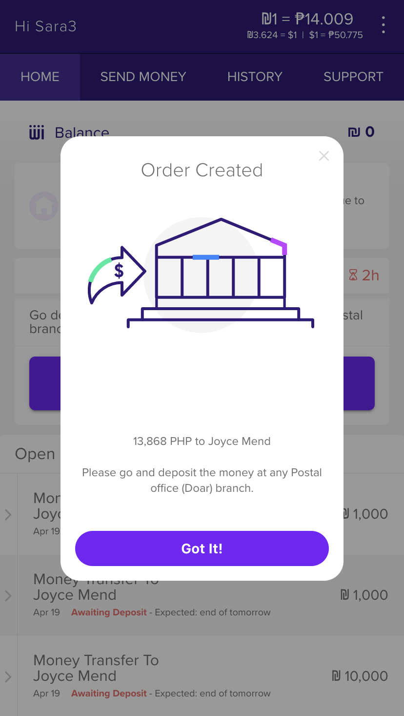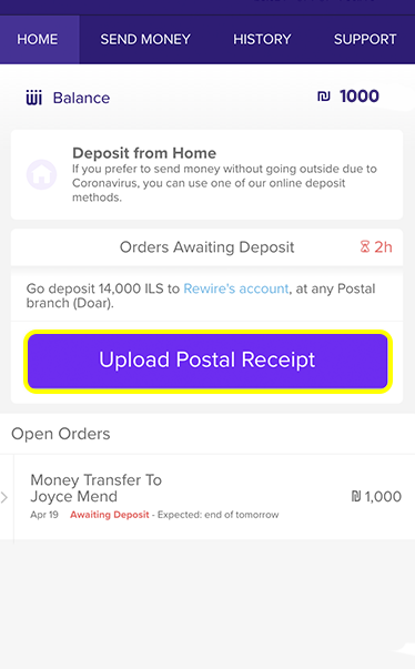 Your account will be credited within an hour of making the deposit. Once you have made the deposit, you will see the new balance in your account click "Upload Postal Receipt" so you can get the ₪30 fee refunded.