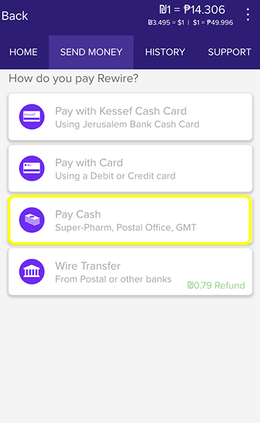 Once on the Send Money tab, enter the amount you want to send (in shekels or in your home country currency) into the calculator. You will see how much you will exactly receive based on today’s rate. Click on Next once you are ready.