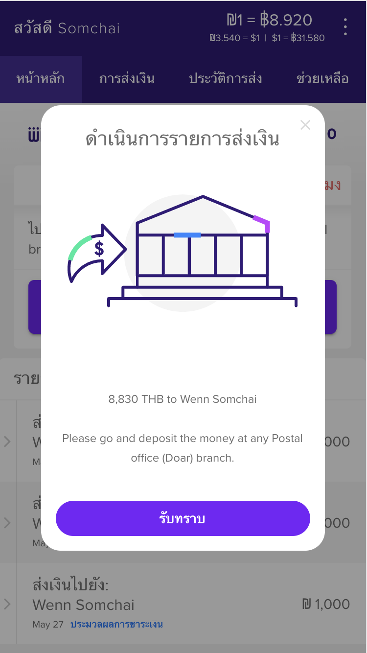 สร้างรายการส่งเงินแล้ว แล้วคลิก "รับทราบ" สังเกตที่รายการส่งเงินที่คุณทำไว้ สถานะรายการจะปรากฎ "รอการฝากเงิน" ตอนนี้เดินทางไปที่สาขา GMT, ที่ทำการไปรษณีย์ของ Super-Pharm ที่คุณเลือกเพื่อฝากเงินเข้าที่บัญชี Rewire ของคุณ