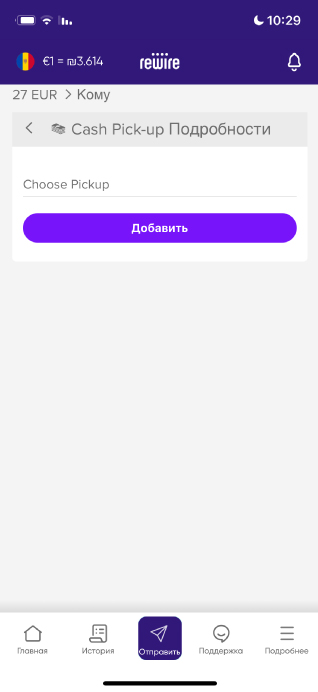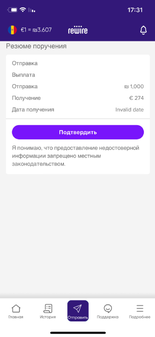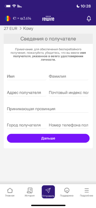 Получение наличных: Получателю наличных придет SMS с кодом, который нужно показать поставщику. Для того чтобы получить деньги, необходимо также показать удостоверение личности, которое соответствует полному имени получателя, указанному в Rewire.