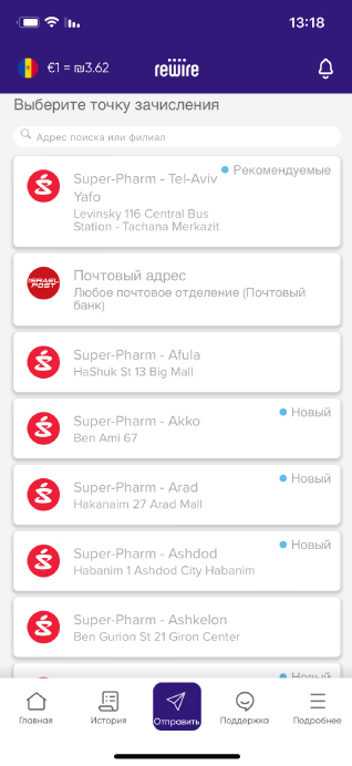 Выберите ближайшее и/или наиболее удобное место для пополнения счета Rewire (почтовые отделения, отделения GMT и Super-Pharm).