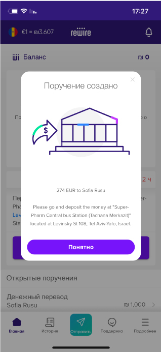 Затем пополните Rewire аккаунт через пункты приемы наличных в GMT, почтовом отделении (Doar) или Super-Pharm. Счет также можно пополнить онлайн, например, банковским переводом с вашего израильского счета или почтового счета Doar. Кроме того, деньги можно отправить с вашей кредитной или дебетовой карты, или напрямую с вашей Kessef Card. После поступления средств на счет Rewire заказ на перевод будет обработан и вскоре выполнен.