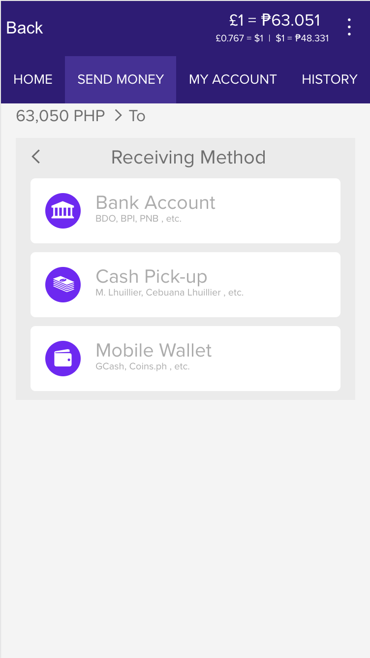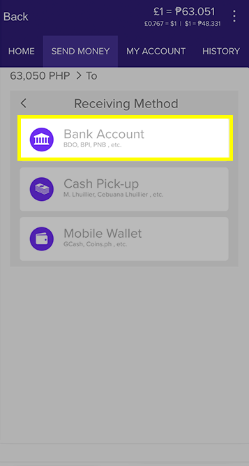 If you would like your Receiver to get a bank transfer, continue to the next step of the wire transfer guide. The other receiving methods are to the Philippines only.