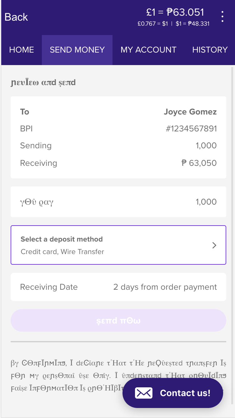 Enter the amount you want to send (in pounds or in pesos for this example or any other currency you are sending) into the calculator. You will see how much you will exactly receive based on today's rate. Click on Next once you are ready. If you have a coupon to add click "Add Coupon" to apply a discount.