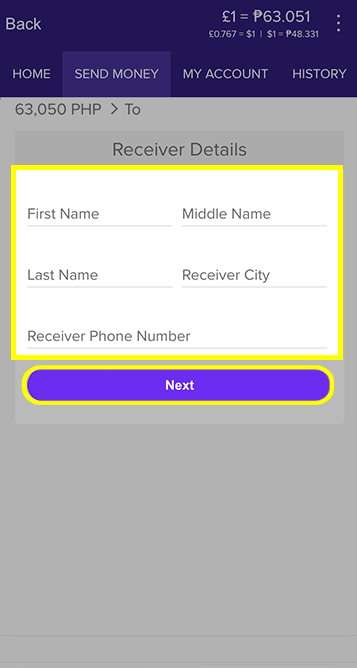 Enter the Receiver's details (first name, last name, receiver city, receiver phone number).