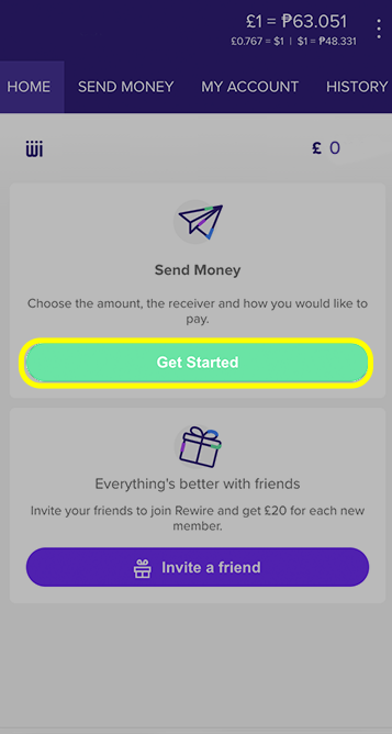 In order to create an order to Send Money with Rewire, click on the Send Money tab or the Get Started button on the homepage.