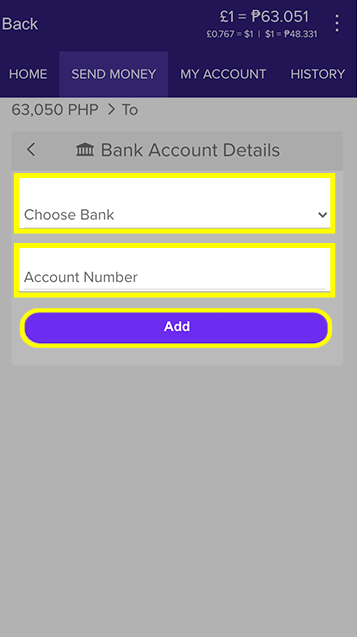 Key in the details (Choose Bank from the drop-down menu, and the enter the account number) of your Receiver.