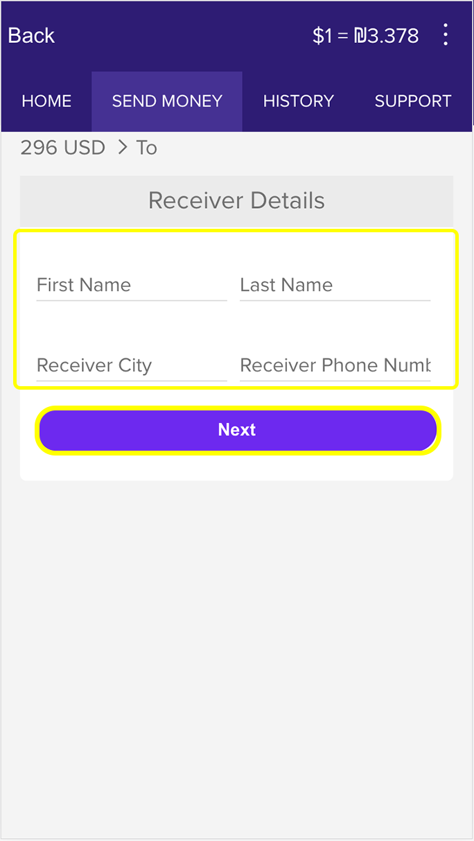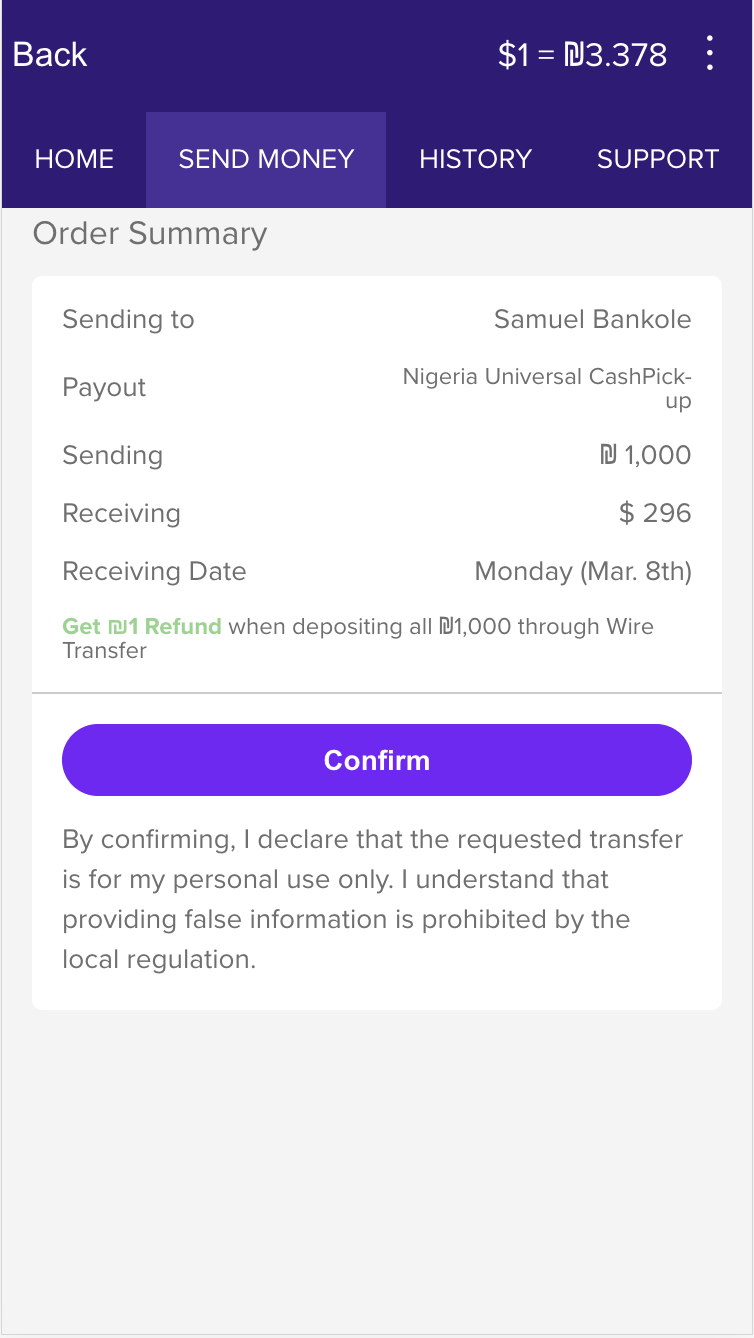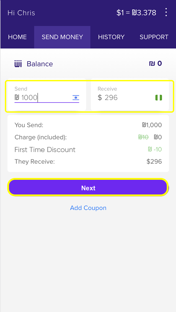 Enter the amount you want to send from ILS into NGN into the calculator. You will see how much you will receive exactly based on today's rate. Click on Next once you are ready.
