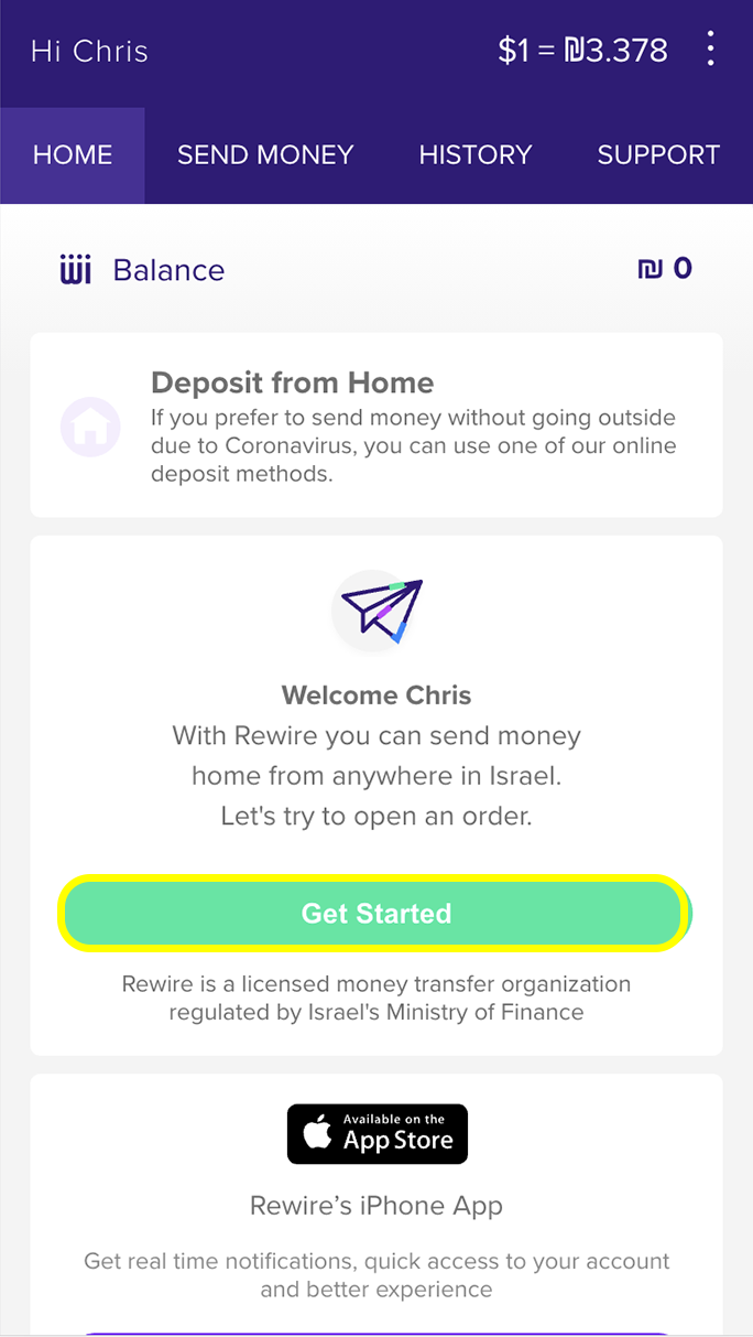 In order to create an order to Send Money with Rewire, click on the Send Money tab or the Get Started button on the homepage.