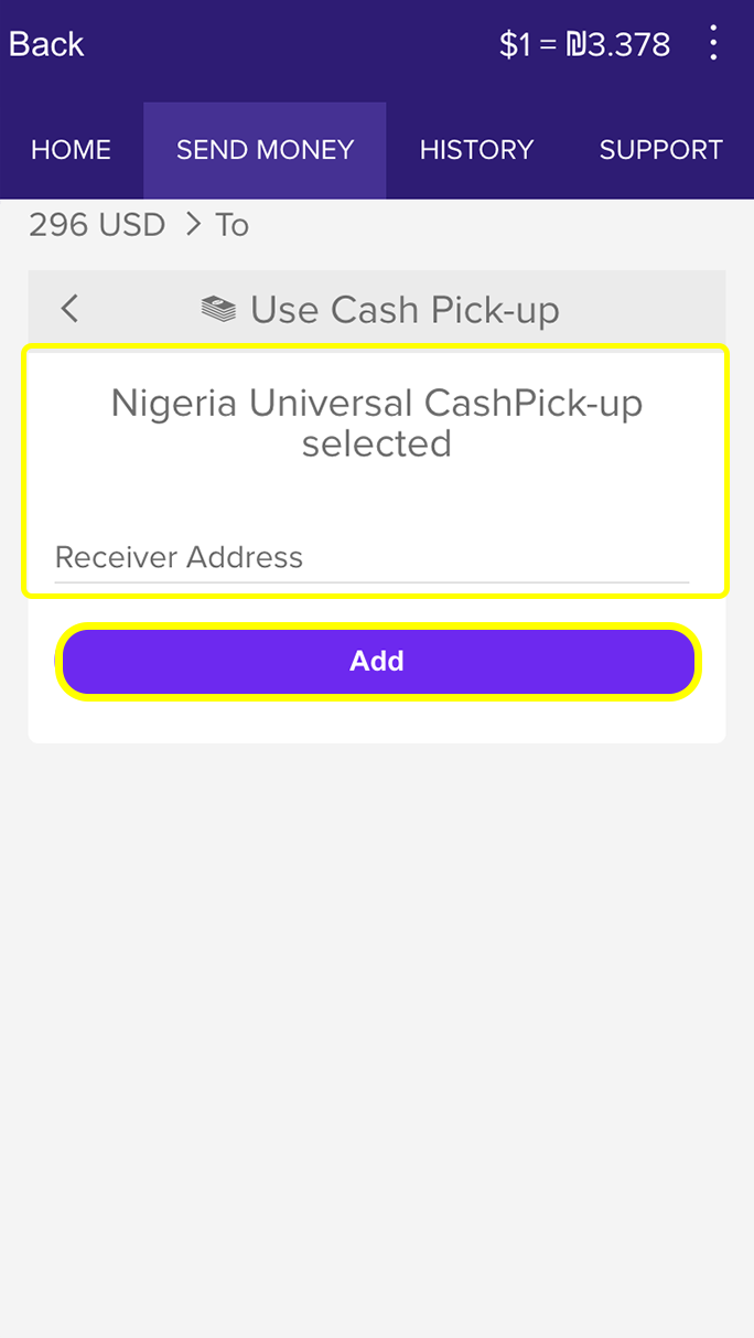 Cash Pick-up is now selected which includes GT Bank and Fidelity banks, now enter the Receiver's address, click "Add".