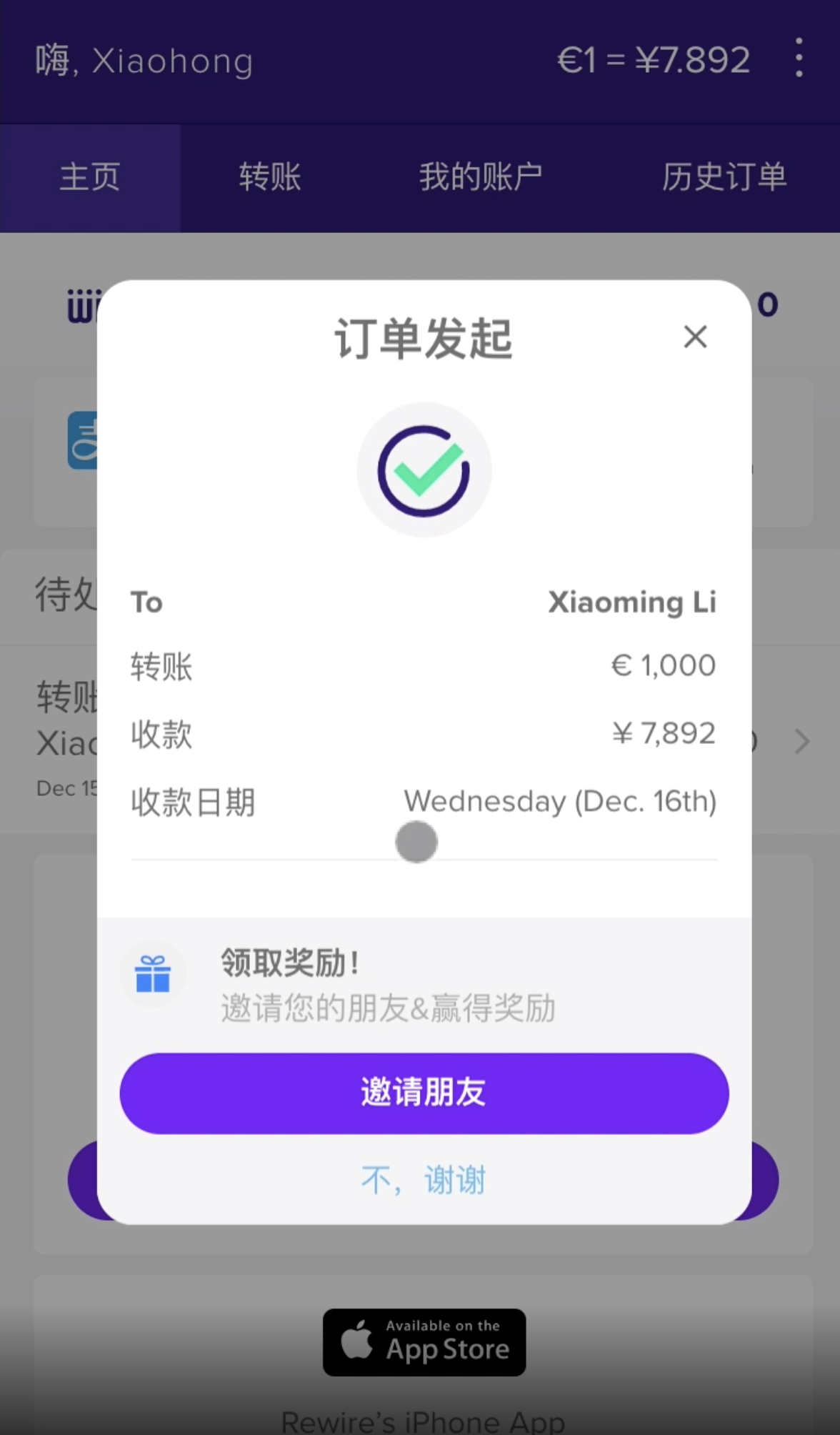 当收款人成功收款后,您将收到短信的确认通知。您还可以通过app来查看汇款成功的确认单。