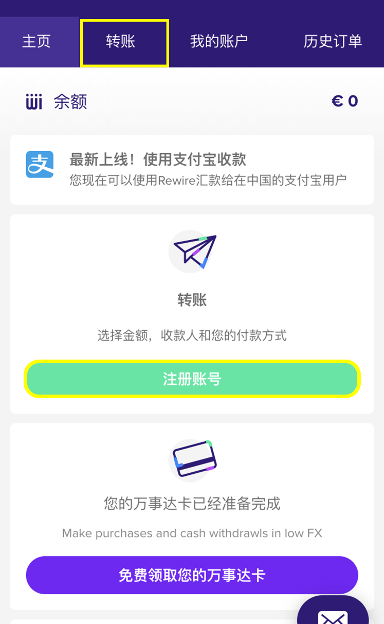 在Rewire平台创建汇款的订单,请点击首页上的“汇款”选项或者进入主页面上的“开始汇款”选项。