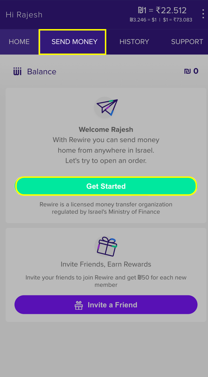 After you log in to your account, you will be on the Home tab. To make an order, click on Send Money button or the green Get Started button.