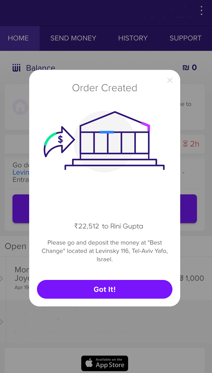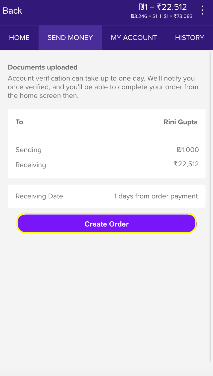 Once on the Send Money tab, enter the amount you want to send (in shekels or in your home country currency) into the calculator. You will see how much you will exactly receive based on today’s rate. Click on Next once you are ready.