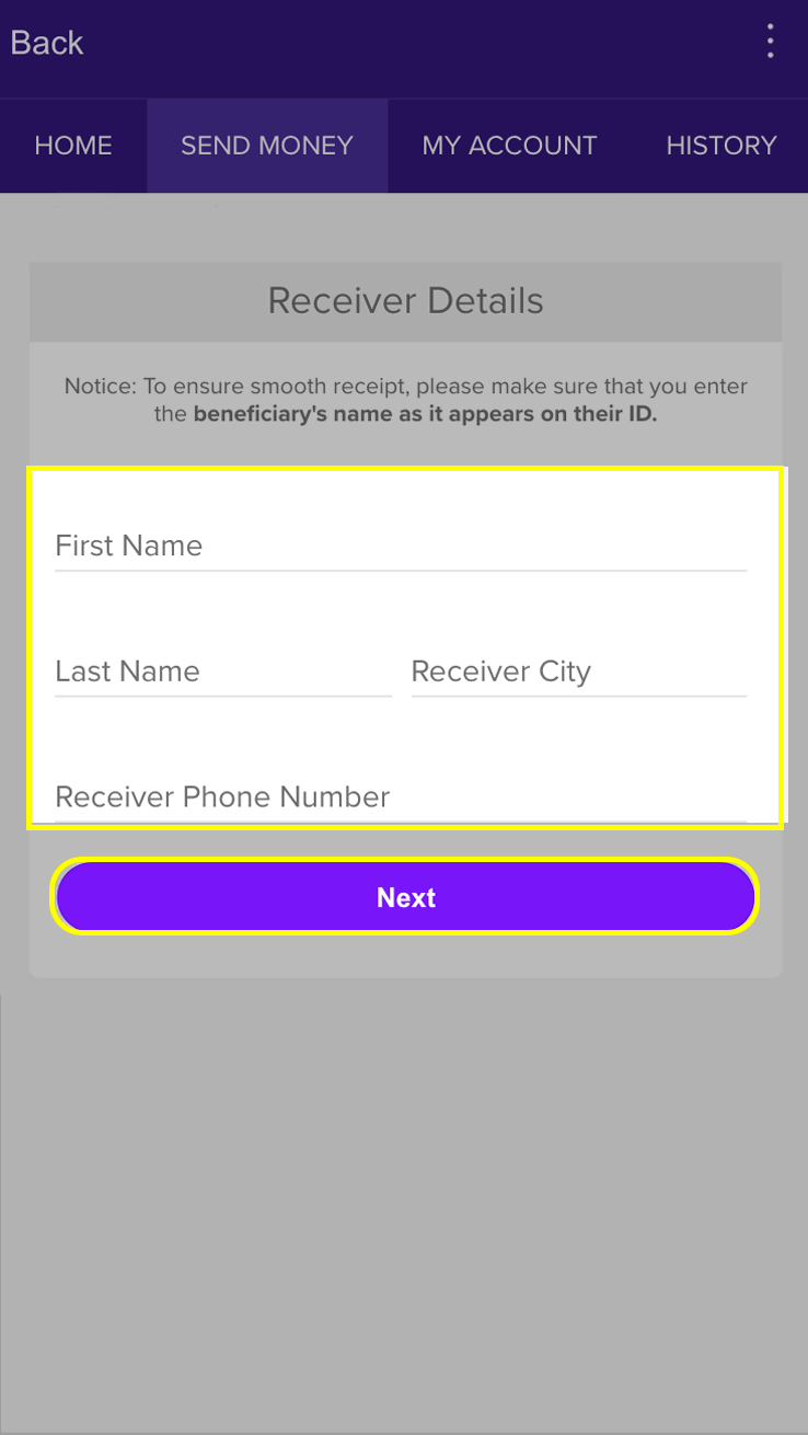 Enter the Receiver’s details (first name, last name, receiver city, receiver phone number).