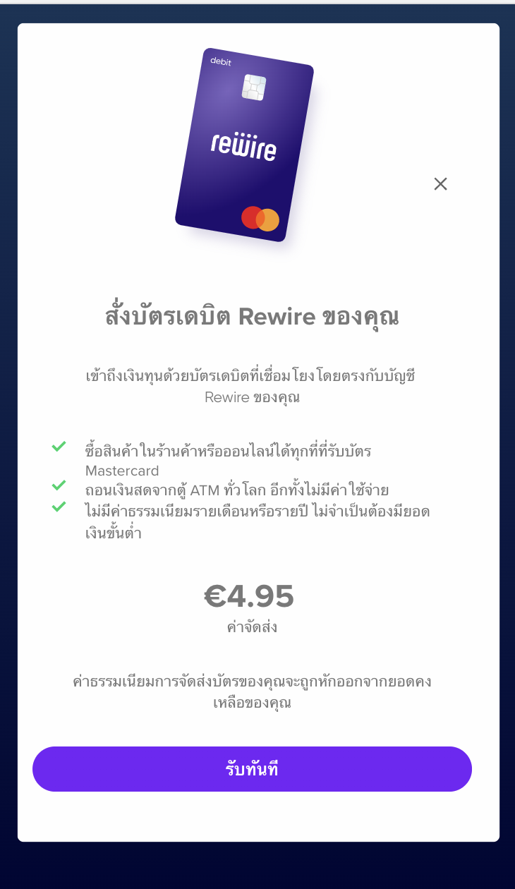 ถ้าคุณเพิ่งสมัครบัญชี Rewire คุณจะต้องทำการยืนยันตัวตนก่อนโดยใช้เอกสารประจำตัวของคุณ และบัตรจะถูกส่งถึงคุณภายใน 2-3 สัปดาห์