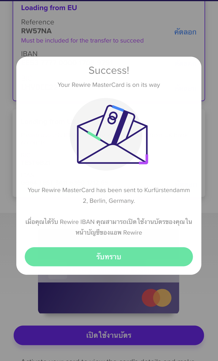 เพื่อความปลอดภัยของการใช้งานบัตร คุณควรรอรับบัตรแข็งให้เรียบร้อยก่อนที่จะเปิดการใช้งานบัตร Visa ดิจิตอลในบัญชี Rewire ของคุณ