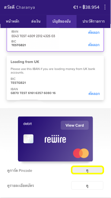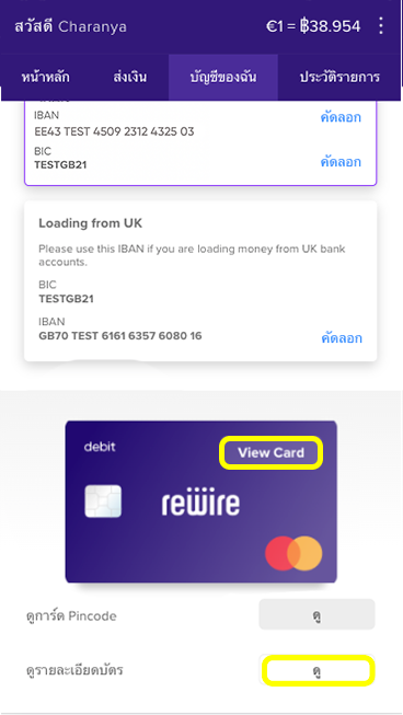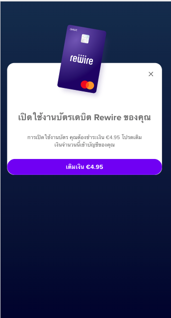 เมื่อคุณตั้งค่าเลขบัญชี IBAN เรียบร้อยแล้ว บัตรเดบิตก็พร้อมสำหรับคุณ เมื่อคุณได้รับตัวบัตรแข็งที่บ้านเรียบร้อยแล้ว ให้เข้าสู่ระบบแอป Rewire ไปที่แท็บ ‘บัญชีของฉัน’ แล้วคลิก ‘เปิดใช้งานบัตร’