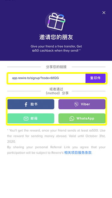 请登录您的帐号,点击”分享Rewire”个人链接,透过社群软件分享您的个人链接给朋友(微信,Whatsapp, 邮箱l, Facebook & Viber等)