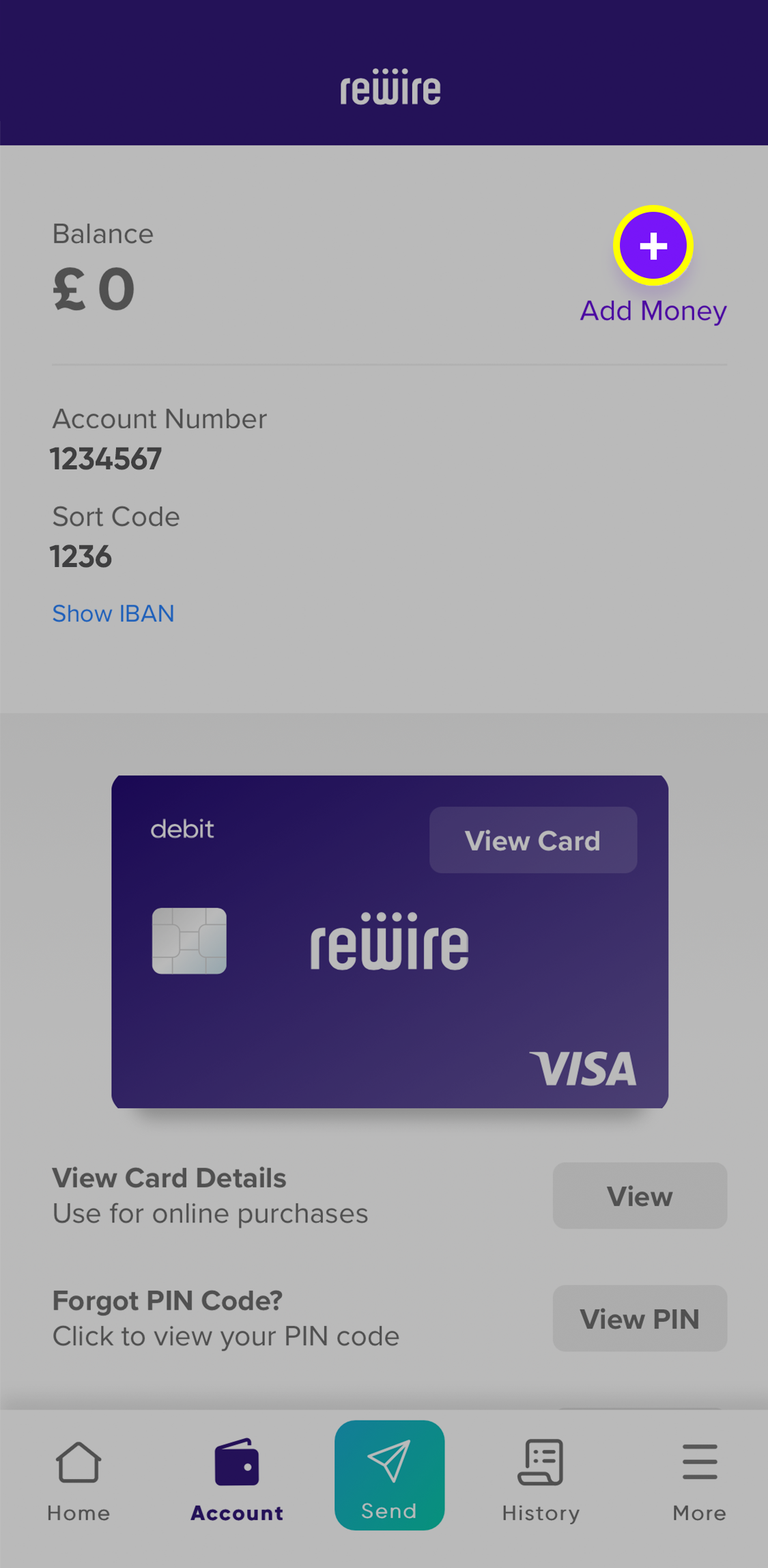 Once logged into your Home tab, click the Account tab, then click +Add Money to load money to your Rewire account.