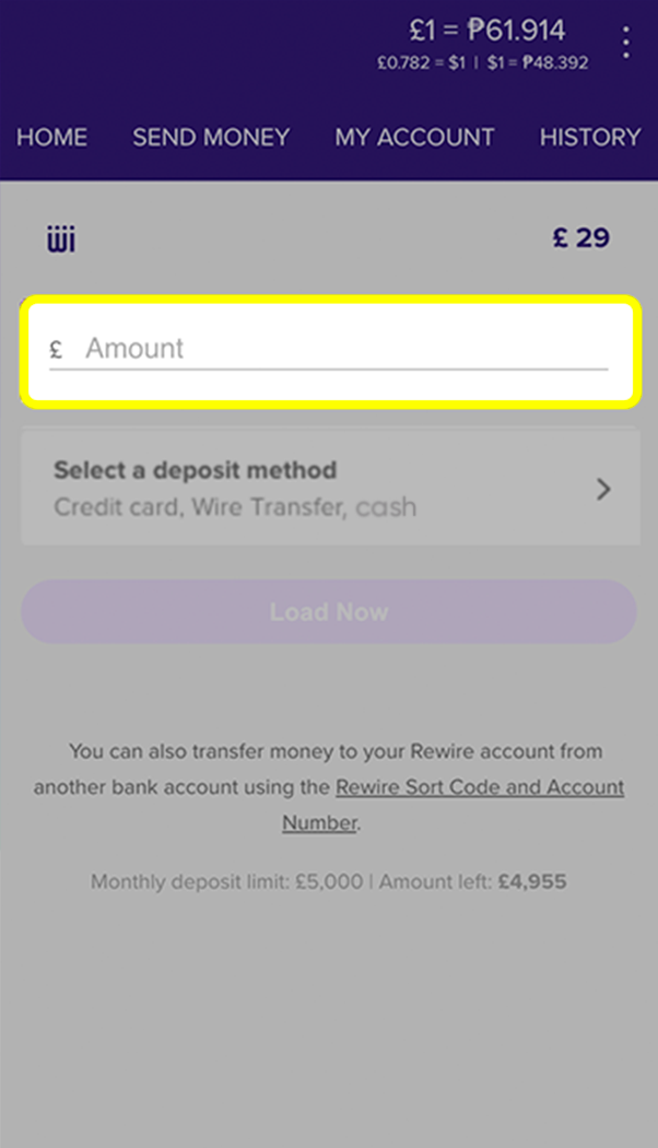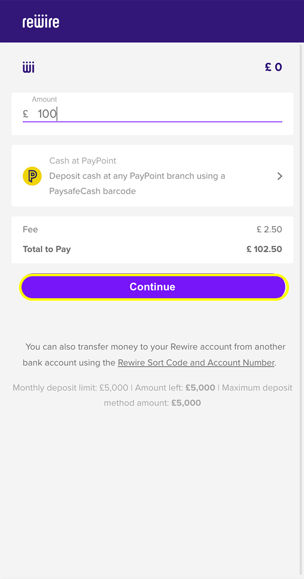 **Note: There is a Rewire limit but also a limit imposed by our cash deposit vendor. Your Cash deposit amount must be within both limits