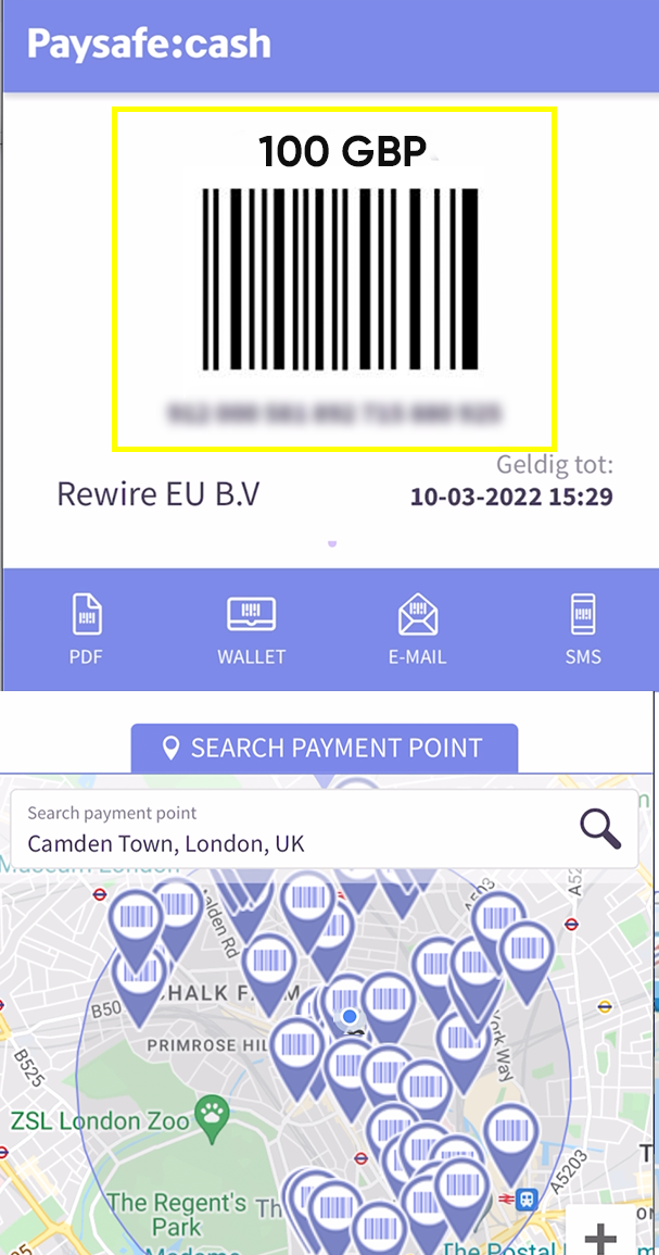 Now you can login to Paysafe and find your deposit barcode. In the map underneath the barcode you find your closest Paysafe cash deposit location. You can click on the points on the map to find the full address details. You will have 2 hours to deposit the cash and use this barcode from the Rewire app.