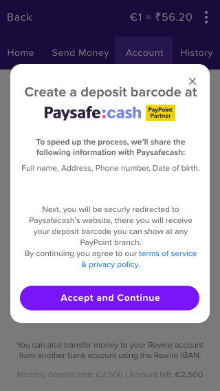 To speed up your registration with Paysafe Rewire can share your following personal details so that some of the steps are already filled in such as full name, address, phone number and date of birth. If you approve click "Accept and Continue." Then you will be asked to enter your Rewire password again to verify your identity.