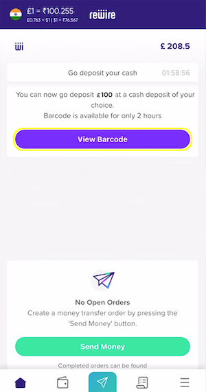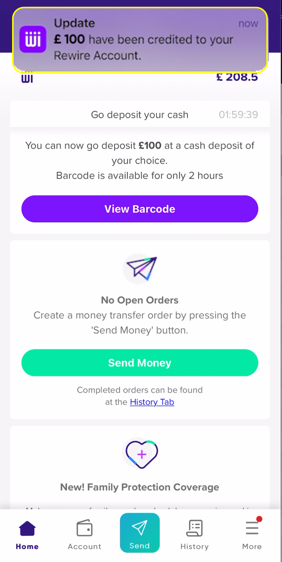 Your account will be credited within 5-10 minutes, once the seller has scanned your Barcode and taken your cash. You will get a small pop up notification that your Rewire account was credited.