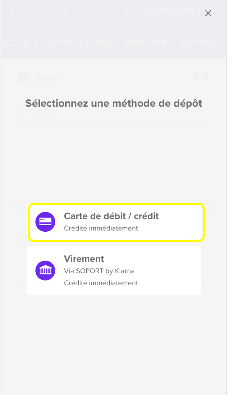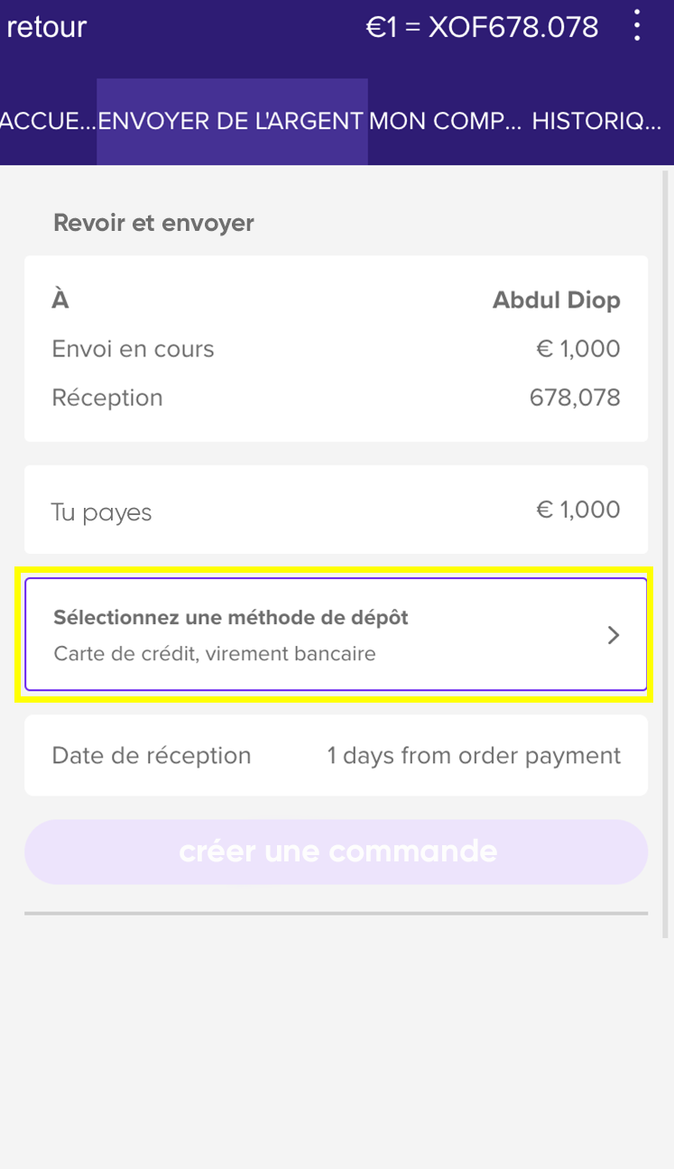 Vous pouvez également charger de l'argent pendant le processus de transfert d'argent, cliquez sur "sélectionner la méthode de dépôt"