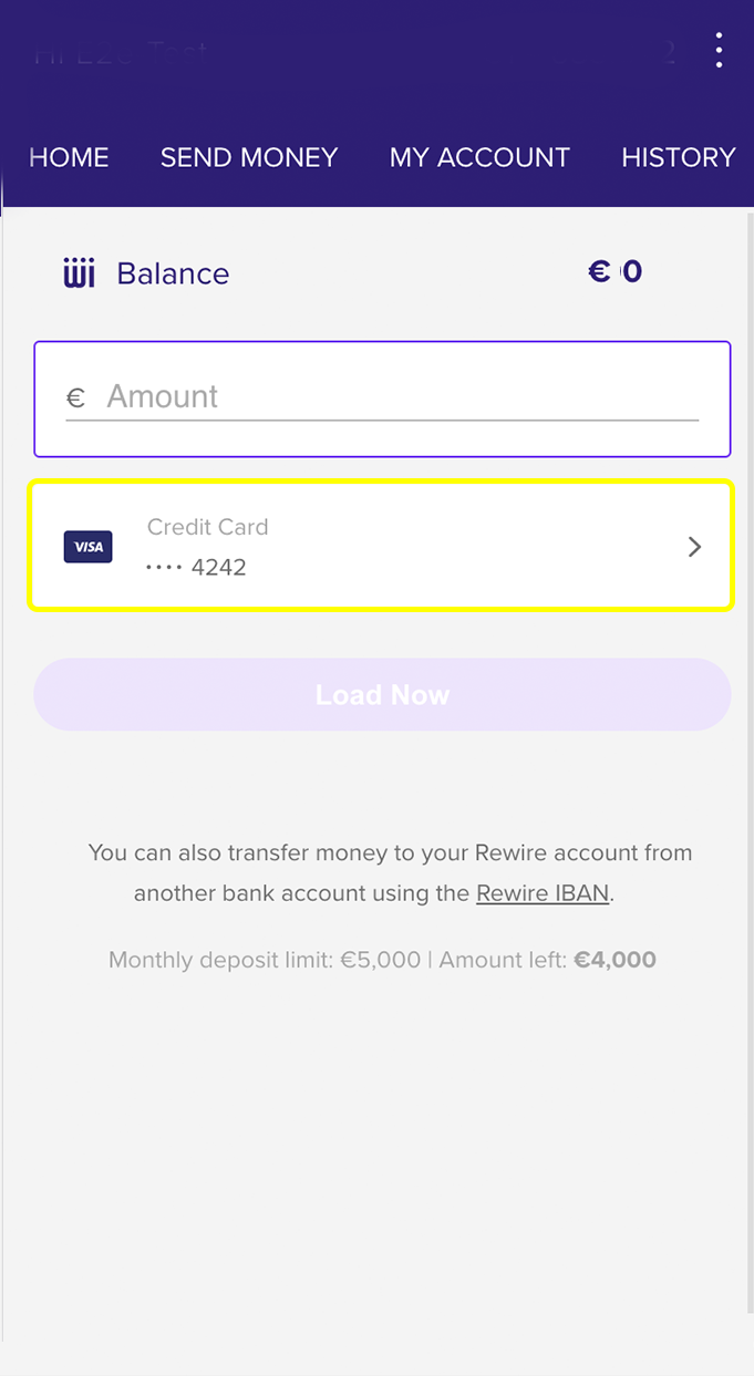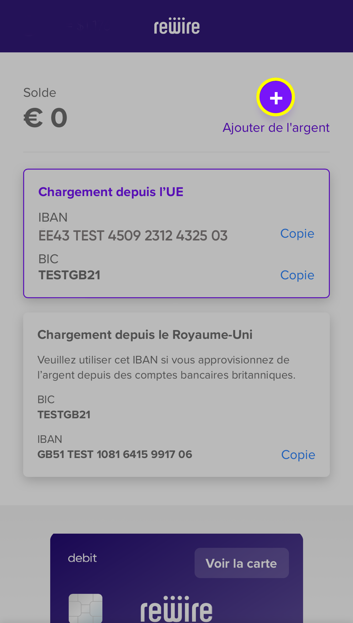 Ces étapes vous guideront pour charger de l’argent sur votre compte Rewire IBAN. Vous avez quelques options pour charger de l’argent par carte de crédit, virement bancaire immédiat et virement depuis votre banque.