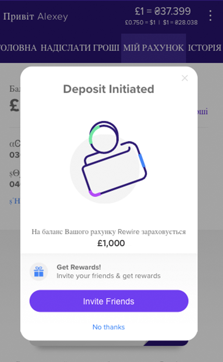 There will be a pop up to confirm that your Rewire account has been credited. Click the X button to acknowledge the credit. The credit will be reflected once the transfer was received. This usually takes a few minutes on the Home page.