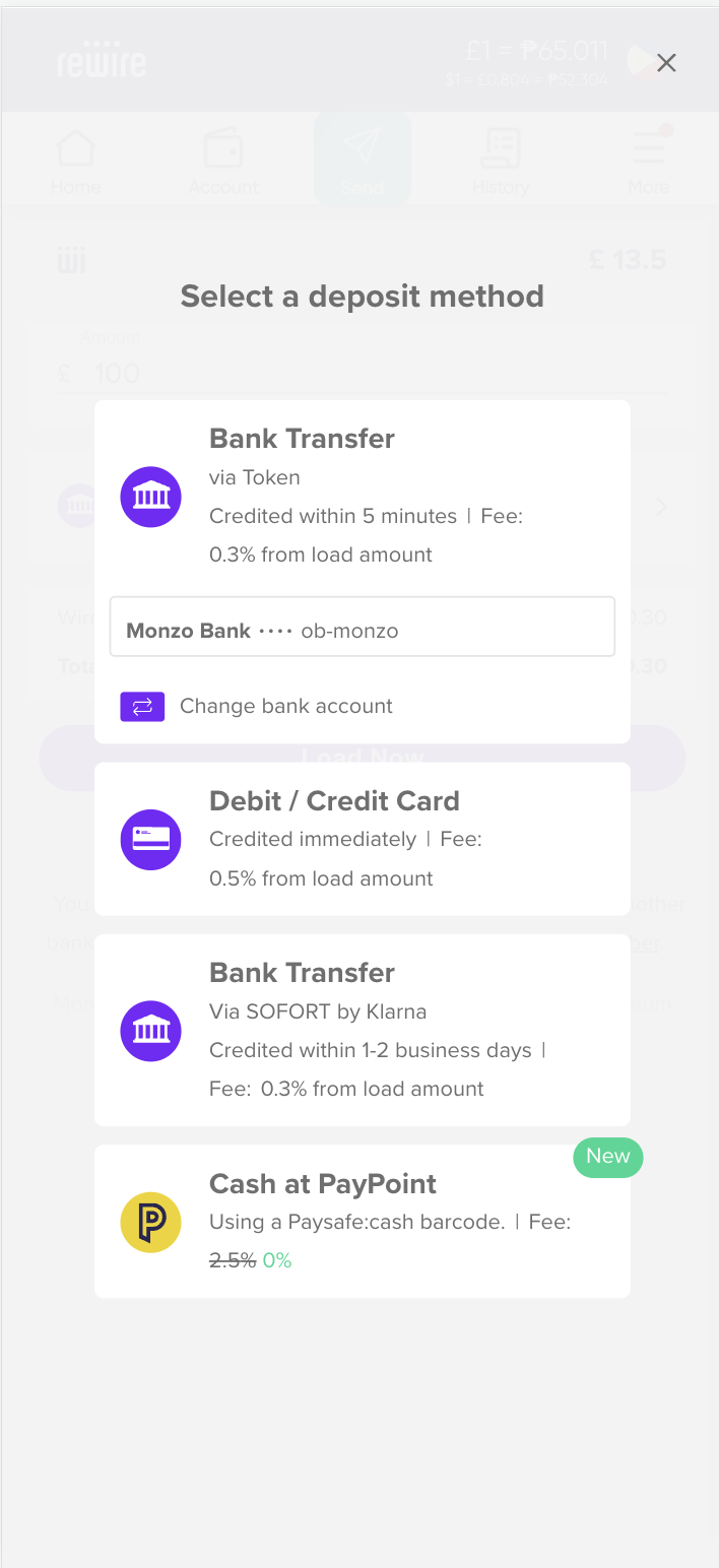 You will see the different options of loading money. Click on "Cash at PayPoint" for the rest of the instructions it's best to go to the cash deposit guide here. https://community.rewire.to/article/how-to-load-cash-to-my-rewire-account-uk/