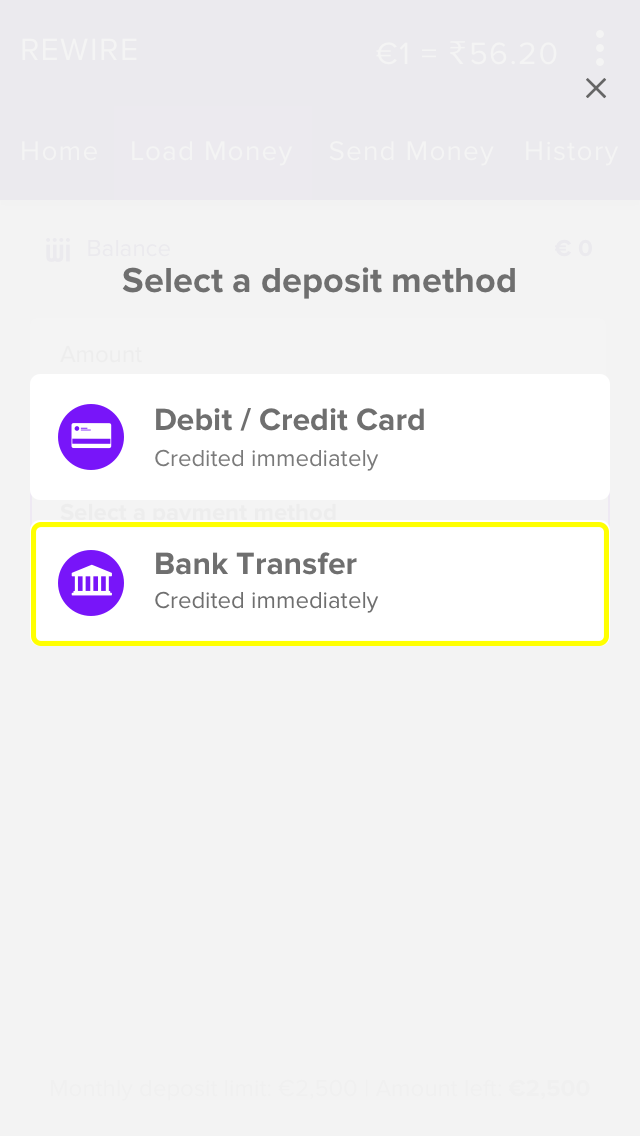 To load by transferring from Bank, send to your Rewire account from your other account. You will find the account number and sort code number in the top of your Account tab. You will have to Copy the account number of your Rewire account. You then have to open a new window of your bank's page in order to make the transaction to your Rewire account.