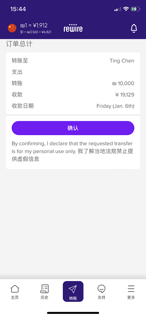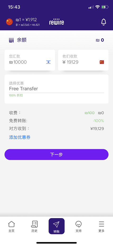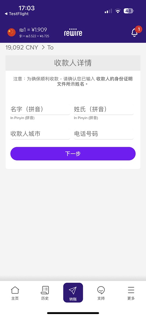 输入您要汇款的谢克尔金额,根据当下的汇率,您将清楚地看到到账人民币金额,核实后,点击下一步。
