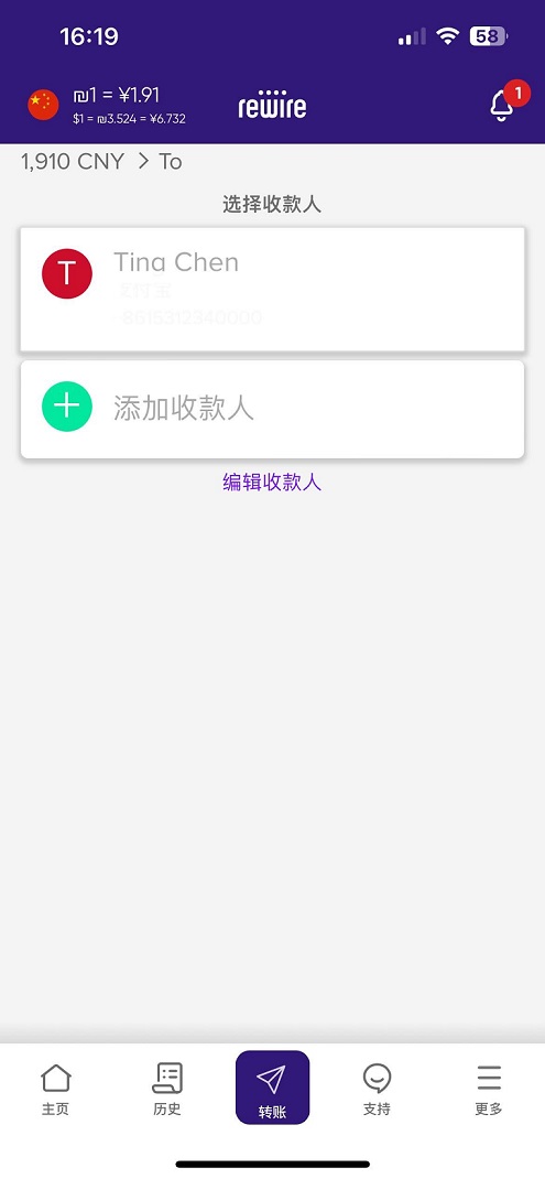 若您是第一次使用,请点击"添加收款人"。如已绑定收款人信息,请直接跳至第6步骤。