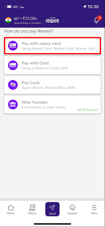 Now you'll need to decide how to make the deposit to your Rewire account. Select Pay with Kessef Cash Card.