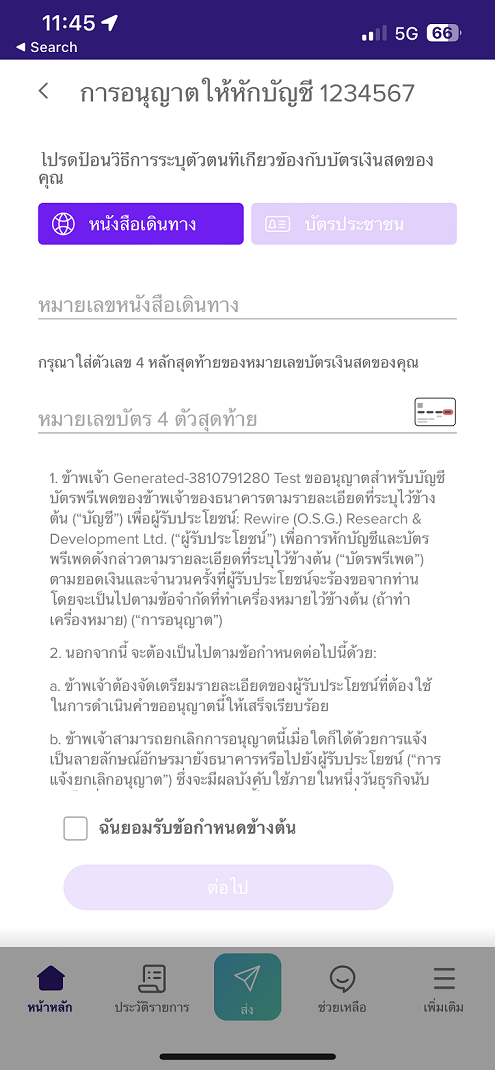 ใส่เลขพาสปอร์ต และหมายเลขบัตรเงินเดือนโดยใส่แค่ 4 ตัวท้าย คุณสามารถตั้งกำหนดลิมิตต่อเดือนได้ แต่จะเปลี่ยนแปลงไม่ได้ เพื่อไม่ให้คุณถูกจำกัดการโอน เราแนะนำให้คุณปล่อยว่างไว้ไม่ต้องใส่ข้อมูลลงไปในช่องนี้ จากนั้นกด ถัดไป "Continue."