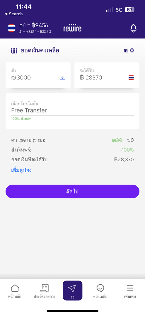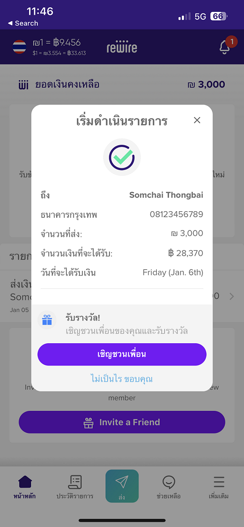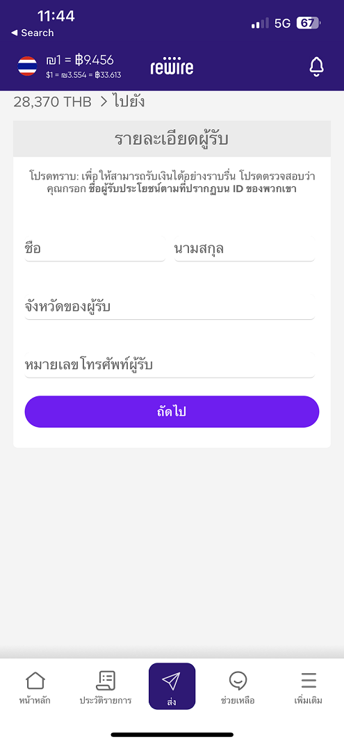 ใส่รายละเอียดผู้รับ(ชื่อนามสกุล จังหวัดที่เปิดบัญชี หมายเลขโทรศัพท์ที่ไทย) จากนั้นกด ถัดไป