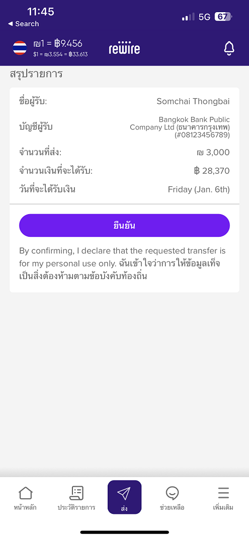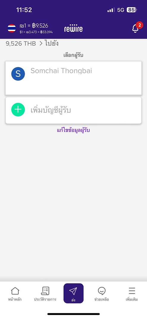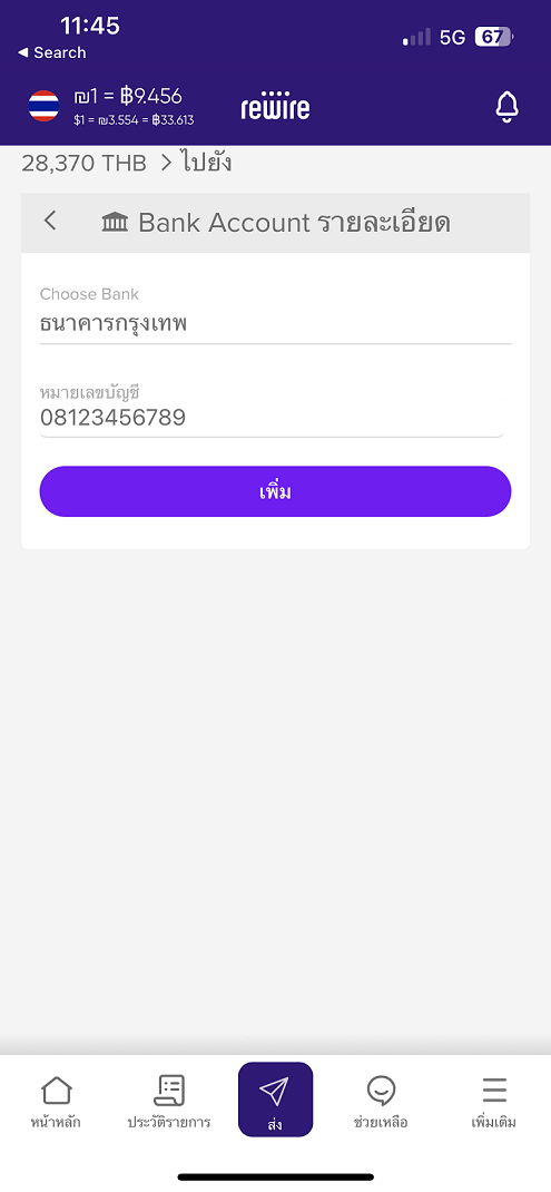 5. เลือกบัญชีธนาคารผู้รับที่ไทย และกรอกหมายเลขบัญชี