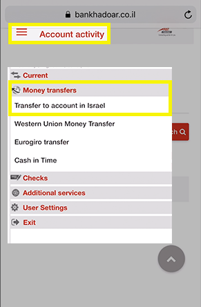 Click on the Account Activity at the top left, then you will get a drop down menu then click on Money transfers then then click on Transfer to account in Israel.
