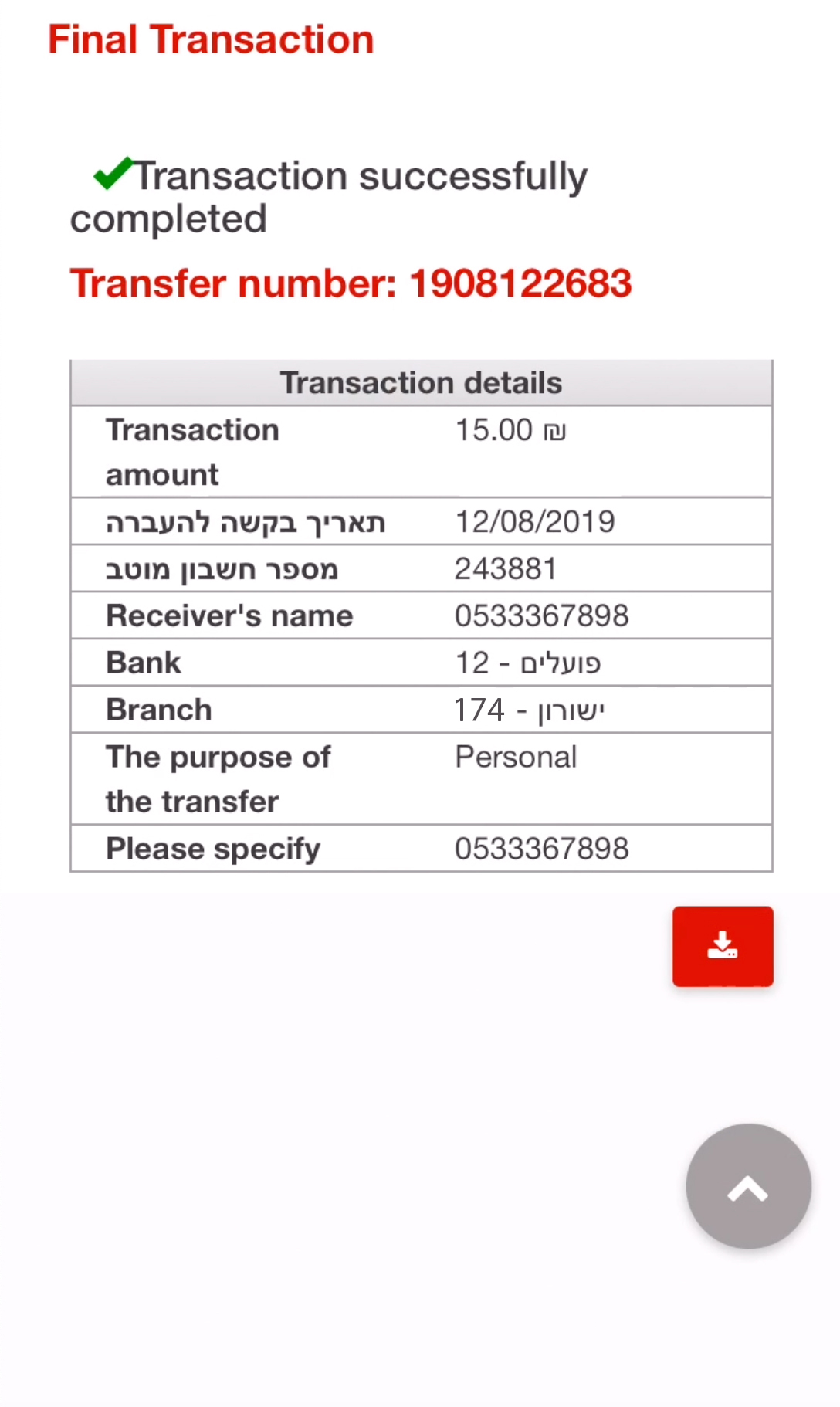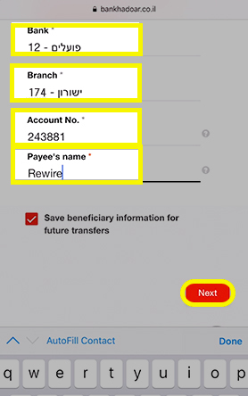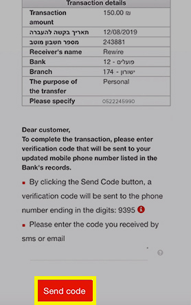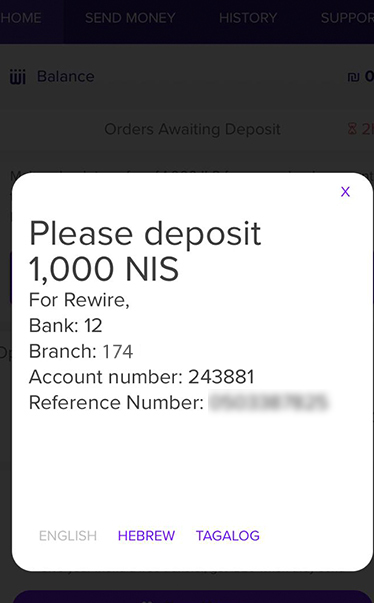 You will have to make a wire transfer to Rewire’s bank account within the next 2 hours. This has to be done using your Israeli bank account (Postal Bank (Doar), Discount, Hapoalim, Leumi etc). Click Got It!