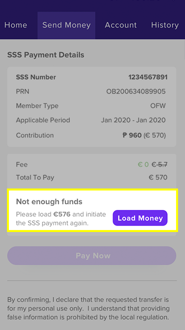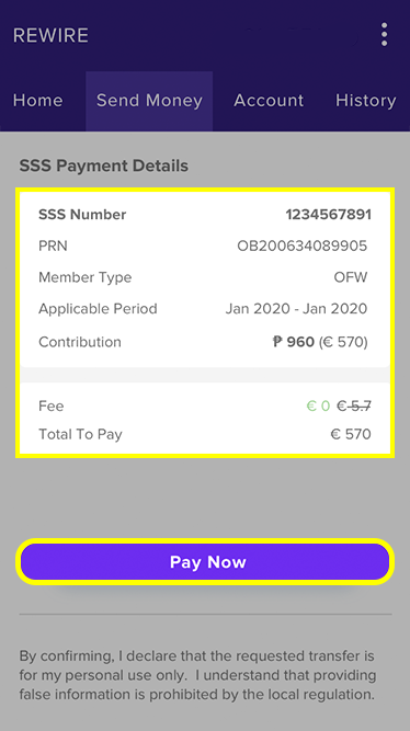 Confirm the SSS payment details, the fee has been taken off, Rewire provides this service free of fees for our customers.