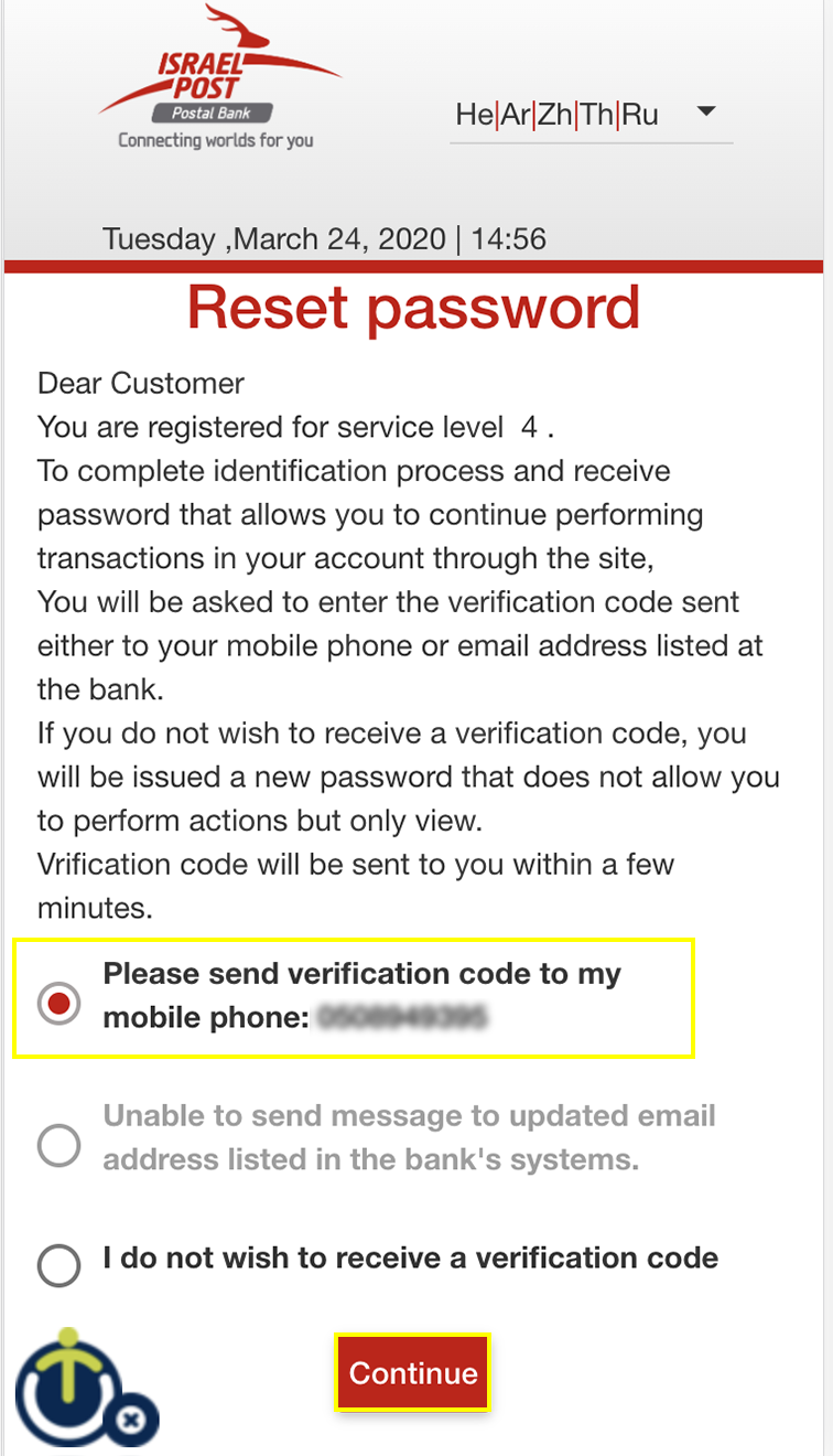 Make sure "verification to mobile phone" is selected then click "Continue."