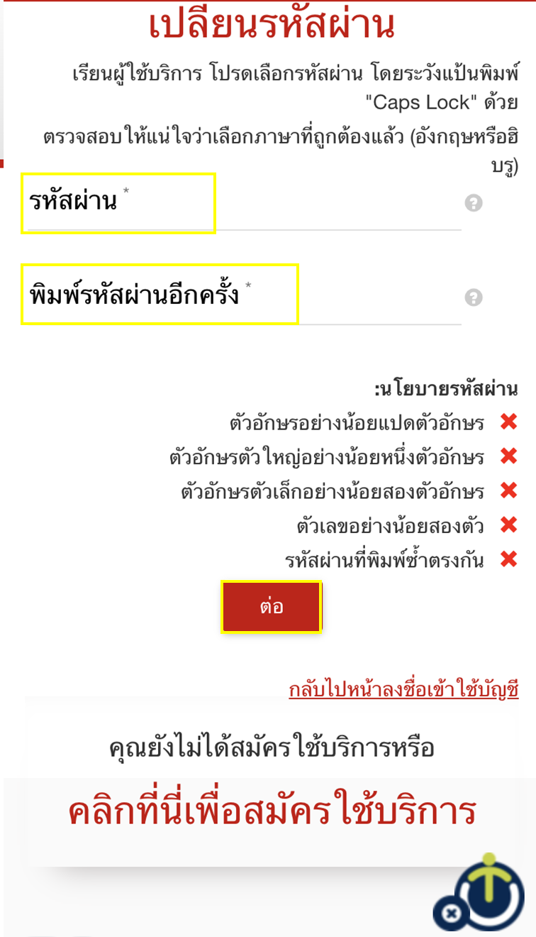 ใส่ระหัสใหม่ ตรวจสอบให้แน่ใจว่า ต้องมีอักษรแลตัวเลขรวมกันไม่น้อยกว่า8ตัว และมีตัวพิมพ์ใหญ่อย่างน้อย1ตัว ตัวพิมพ์เล็กอย่างน้อย 2 ตัวและตัวเลขอย่างน้อย 2ตัว ทำซ้ำในบรรทัดถัดไป และคลิ๊ก ดำเนินการต่อ
