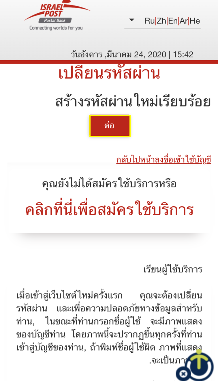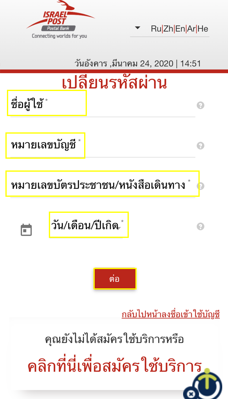 ตรงนี้ใส่ ชื่อผู้ใช้ของคุณ เป็นรายละเอียดแรกสำหรับการดึงรหัสผ่าน ไปยัง https://www.bankhadoar.co.il/#/Login/ResetPasswordและเป็นภาษาที่มุมขวาด้านบน