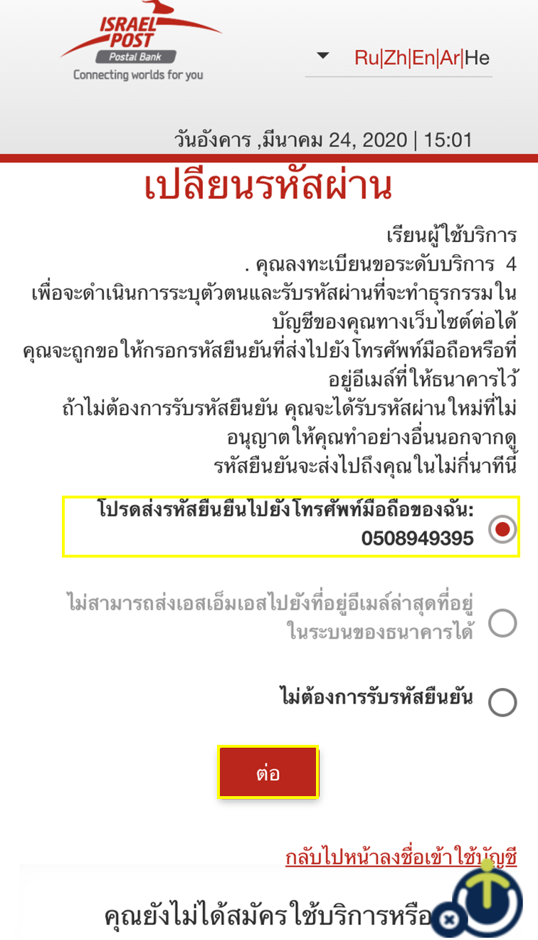 คุณจะได้รับระหัสที่ส่งไปยังโทรศัพท์มือถือของคุณ ป้อนะรหัสยืนยันแล้ว คลิ๊ก "ดำเนินการต่อ."