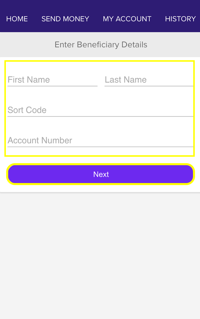 Click "Add Receiver" on the screen before if adding someone new or click on existing beneficiary. If new, enter the beneficiary's details including first and last name, sort code and account number. Then click "Next."