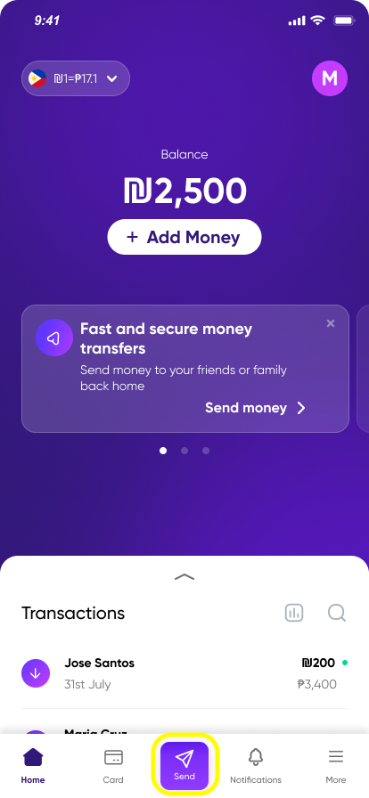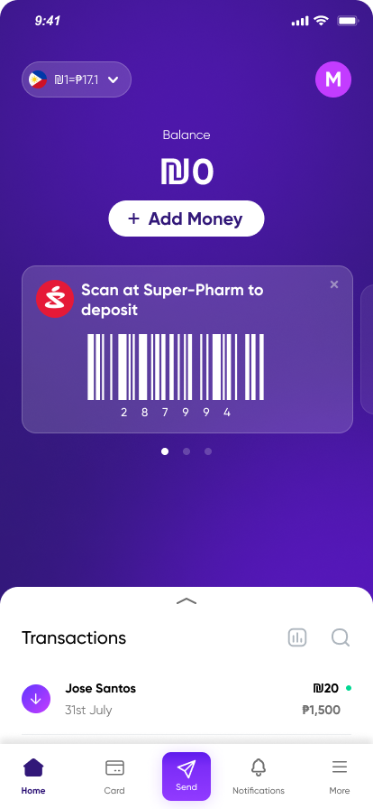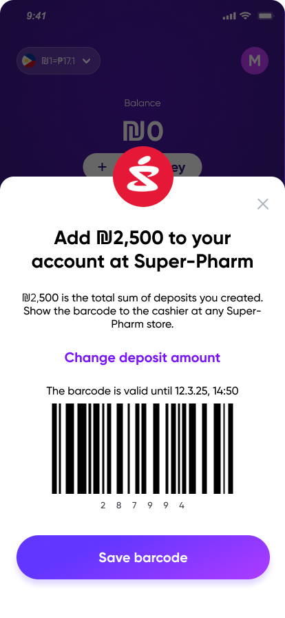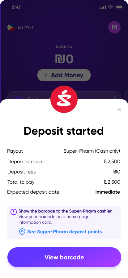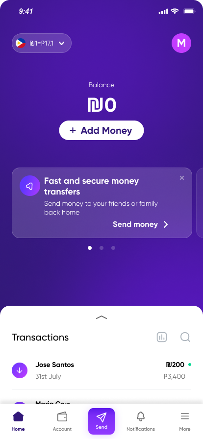Your balance is ready—send money back home with 0 ₪ sending fees.