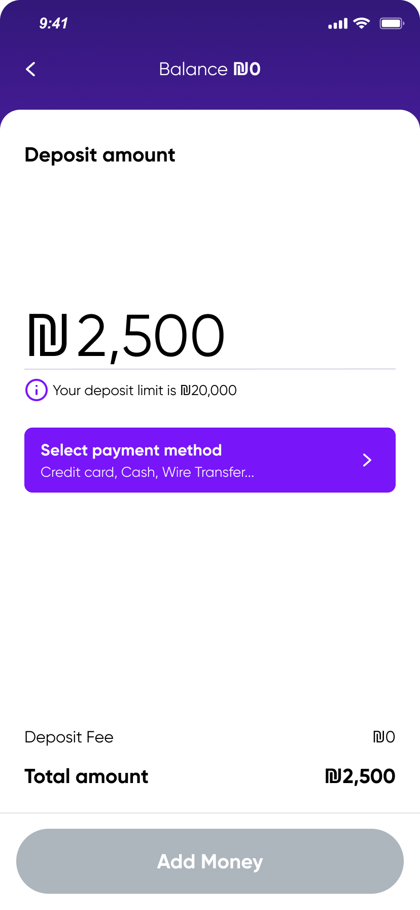 Enter how much you’d like to deposit. Tap Select Payment Method (or Change if one is already selected), then tap 'Add Money'.