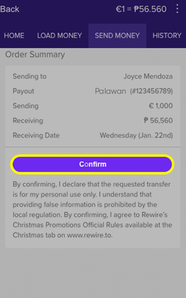 Take note of the expected date you will receive the payment in your receiving country. Click on Confirm to confirm the order. If you haven't yet loaded money to your Rewire account click here for a guide.